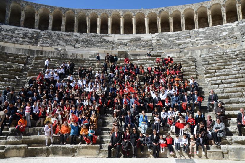 İlk Tören Cumhuriyet Meydanı'ndaki Atatürk büstü önünde saygı duruşu, İstiklal Marşı ve ardından çelenk sunumuyla başladı. Buradaki törenin ardından etkinlikler Tarihi Antik Aspendos Antik Tiyatrosu'nda devam etti. Antik tiyatrodaki törene Kaymakam Cemal Şahin, Belediye Başkanı Kadir Kumbul, İlçe Jandarma Komutanı Üsteğmen Ali Duman, İlçe Milli Eğitim Müdürü İkram Ekiz, kurum müdürleri, STK temsilcileri, öğretmenler, vatandaşlar ve öğrenciler katıldı.