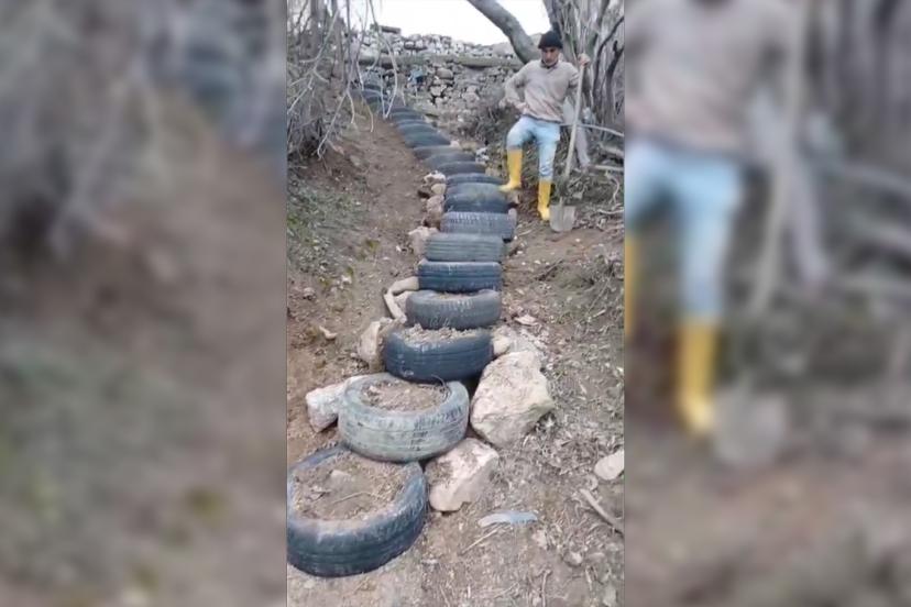 Lastiklerin içini toprakla doldurarak sabitleyen mahalleli, böylece hem kaymayı önledi hem de daha güvenli bir geçiş yolu oluşturdu.