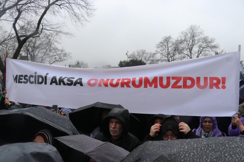 Sağanak yağışa rağmen binlerce kişinin katılımıyla gerçekleştirilen ve sık sık işgal rejimi ile ABD'ye karşı sloganların atıldığı yürüyüş, Beyazıt Meydanı'nda son buldu.