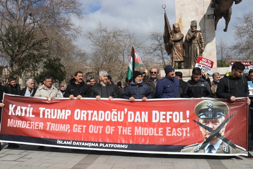 Fatih Saraçhane Parkı'nda bir araya gelen yüzlerce kişi, "Katil Trump Ortadoğu'dan Defol", "Katil İsrail, Katil ABD" yazılı pankartlar tutarak, işgal rejimi ve Amerika aleyhine sık sık "Zalimler İçin Yaşasın Cehennem", "Katil İsrail, Katil ABD" gibi sloganlar attı.