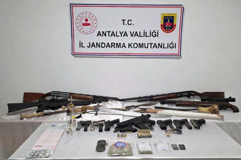 Antalya İl Jandarma Komutanlığı ekiplerince, Antalya Cumhuriyet Başsavcılığı talimatları doğrultusunda uyuşturucuyla mücadele çerçevesinde Konyaaltı ilçesinde bulunan 1 şüphelinin ikametinde arama yapıldı. Aramada; 8 ruhsatsız tabanca ve şarjörleri, 150 tabanca fişeği, 3 av tüfeği, 2 havalı tüfek, 2 kılıç, 4 pala, 102 gram kubar esrar, 5 gram metamfetamin, 3 uyuşturucu kullanma aparatı, esrar öğütme aparatı, hassas terazi ile suçtan elde edildiği değerlendirilen bir miktar para ele geçirildi. Şüpheli hakkında adli tahkikata başlatıldığı bildirildi.