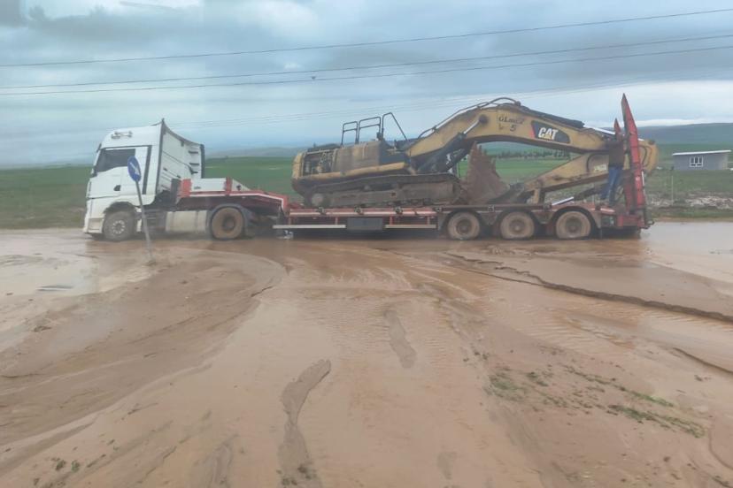Aynı güzergahta bulunan ve üzerinde kepçe yüklü olduğu öğrenilen bir tır ise kaygan zemin nedeniyle yan yattı.