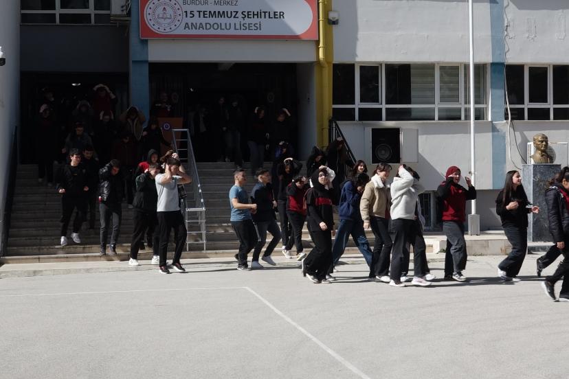 BURDUR'da 1-7 Deprem Haftası dolayısıyla 15 Temmuz Şehitler Anadolu Lisesi'nde deprem tatbikatı gerçekleştirildi.