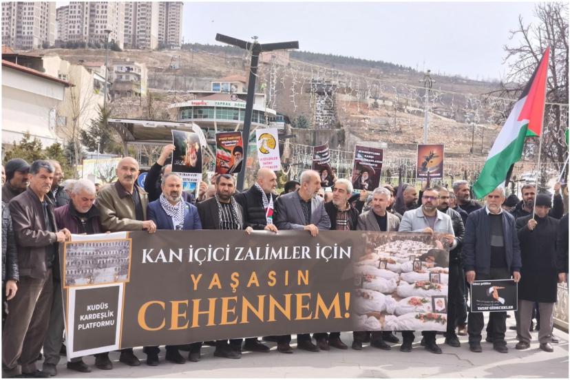 Malatya'da Kudüs Kardeşlik Platformu tarafından emperyalist ABD ve işgal rejiminin İran'a yönelik saldırılarını tel’in etmek amacıyla cuma namazı sonrası Kernek Karagözlüler Camii bahçesinde basın açıklaması düzenlendi.