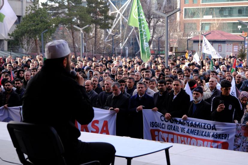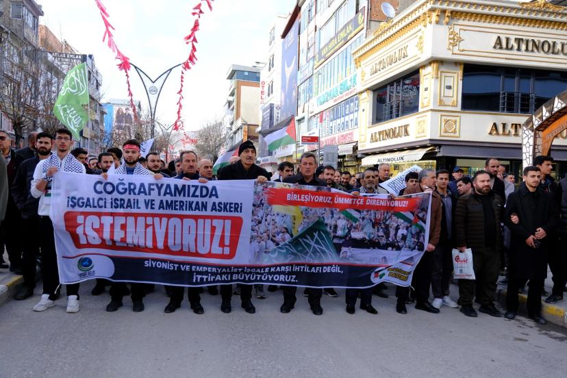 Ümmet coğrafyasının, siyonist rejim ve işbirlikçisi ABD tarafından ateş çemberine alındığını söyleyen Çevik, “Ümmet coğrafyası ateş çemberinde, Çocuklar, kadınlar ve masumlar gözlerimizin önünde her gün katlediliyor. Bizlere evlerimizde oturmak yakışmaz, işte bugün zalime karşı mazlum kardeşlerimizin yanında olduğumuzu haykırmak ve tüm dünyada bu zalimleri lanetlemek ve zulmün durdurulmasını da bizleri yönetenlerden istemek için bir araya geldik. İşgalci İsrail ile işbirlikçisi ABD’nin yıllardır uyguladığı 'böl, parçala, yut' senaryolarına karşı çıkmak, Gazze’ye, Lübnan’a ve son olarak komşumuz İran İslam Cumhuriyetine yapılan saldırıları ve katliamları lanetlemek için buradayız. Bizler, bölgemizde yürütülen kirli senaryoları, zulmü ve katliamları lanetliyoruz. Bölge halklarının iradesini yok sayan, sınırları kanla yeniden çizmeyi hedefleyen hiçbir askeri girişimi, işgali ya da saldırıyı kabul etmiyoruz. Kendi topraklarımızda hem işgalci İsrail’i hem de bölgeyi kaos bataklığına çeviren Amerikan askeri varlığını reddediyoruz. ABD ve İsrail karşısında direniş dışında bir tercihin olmadığı yaşanan süreçle ortaya çıkmıştır. Teslimiyetçi zihniyetin sonu kardeş ve dost ülkelerde katliam ve soykırım yapılırken, kendisine ne zarar verirse versin ABD üslerini ve radarlarını savunmaya varmıştır. Bugün islam ülkelerinin yöneticileri, ülkelerinin geleceğini ve tam bağımsızlığını düşünüyorlar ise ABD ve İsrail'e karşı Yahya Sinvarın başlattığı direniş destanına destek vermelidirler. Sessizlik, sonu olamayan bir çukurdur. İnsanlığın ortak düşmanı olan ABD ve İsrail şer ittifakı, biz kendimizle ilgili tüm değerleri bir kenara koymadan, onların kulu, kölesi ve gönüllü askerî olmadan bizlerden razı olmayacaklardır.” dedi.