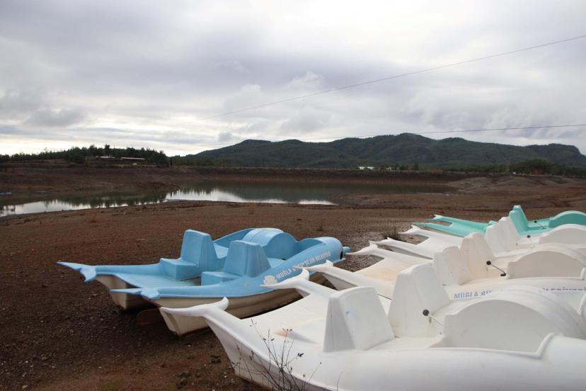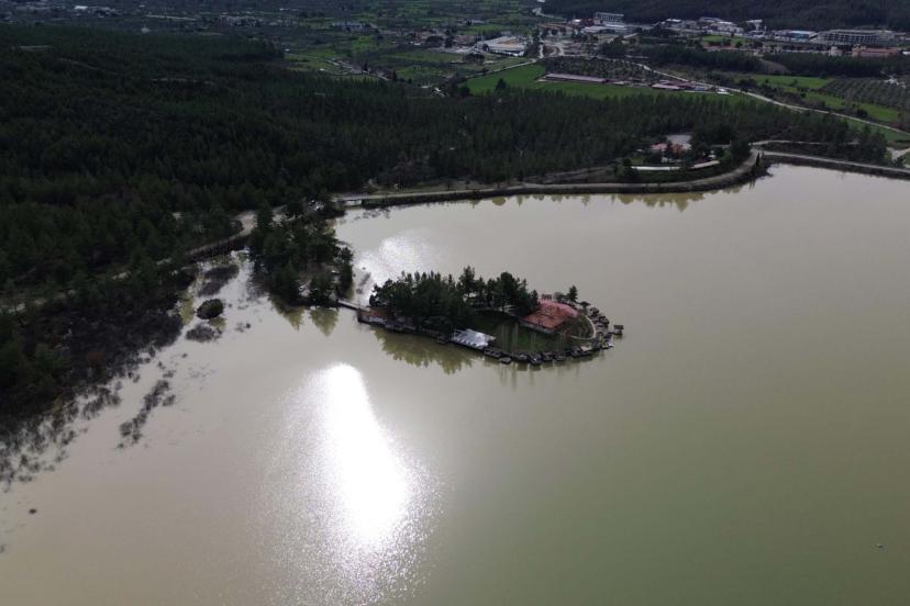 MUĞLA'da kuraklık nedeniyle su seviyesi ciddi oranda düşen ve son yağışlarla birlikte yeniden dolmaya başlayan Ula Göleti, dronla görüntülendi.