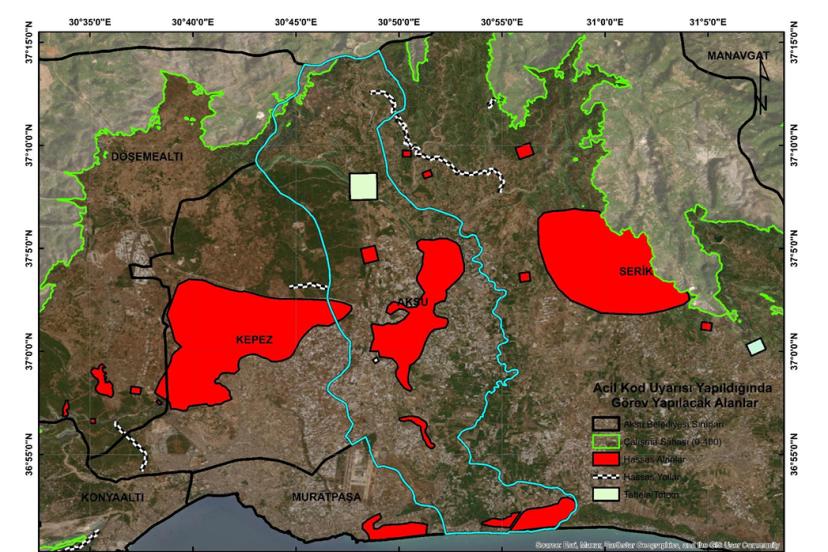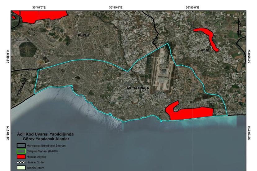 Planda 0-400 metre rakımdaki sahil kesimindeki ilçelerin belediyeleri, jandarma, emniyet ve Sahil Güvenlik Komutanlığı sorumluluğundaki 125 hassas alan ve yol güzergahı da tek tek yer alıyor. Antalya Valiliği veya kaymakamlıklar tarafından Antalya İli Orman Yangınları Önleme Planı doğrultusunda belirlenen alan ve güzergahlarda 'Acil Kod' uyarısı yapıldığında, özellikle bu 125 hassas alan ve yol güzergahında itfaiye araçları, iş makineleri ve ekiplerle gerekli önlemleri alacak. Ormanlardaki tüm güzergahlarda yangına sebebiyet verebilecek çöpler temizlenecek ve bu bölgelerdeki vatandaşlara gerekli tüm uyarılar yapılacak. Plan kapsamında belirlenen, ormanlarla yerleşim yerlerinin iç içe olduğu mahalle ve bölgelerde, belediye zabıta ekipleri tarafından devriye faaliyetleri yürütülecek; yapılacak anonslarla halk, yangına sebebiyet verebilecek davranışlardan kaçınmaları konusunda düzenli olarak uyarılacak.