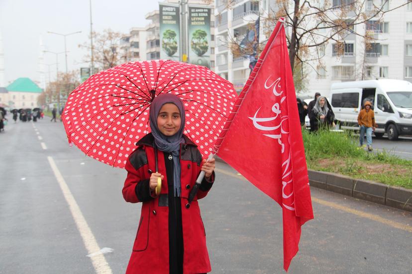 Duygularını dile getiren Şehide Ay "Yağmur da olsa herkes gelmeli. Peygamberimiz nasıl kendisini feda ettiyse ümmeti için yani biz de onun için kendimizi feda ettik. Yağmur da olsa gelmeliyiz buraya. Hepimiz burada duygularımızı anlatıyoruz. Ne güzel bir ortam, ilahiler söyleniyor, Kur'an-ı Kerim okunuyor, bize sohbet anlatılıyor. Ondan sonra ben maalesef Batman'dakine gelemedim. Medresede okuyorum ama çok gelmek istiyordum. Buraya geldim bu sefer içimi rahatlatacağım. Peygamber Efendimize buradan salat ve selamlar gönderiyorum. Burada Peygamber Efendimizi görmedik ama sanki O'da buradaymış gibi hissediyoruz ve ona salat ve selamlarımızı gönderiyoruz. Onun için bayraklar sallıyoruz. Çok güzel bir duygu, çok güzel hissettiriyor burası. Yağmur da olsa herkesin gelmesini dilerim." dedi.